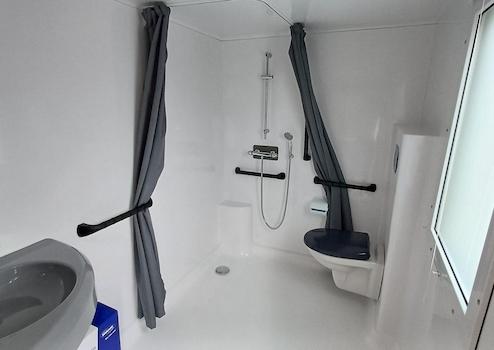Barrierefreies Bad mit ebenerdiger Dusche, stabilen Haltegriffen und zusätzlicher Fläche für Rollstuhlfahrer. Sicher und funktional ausgestattet.