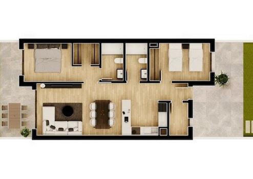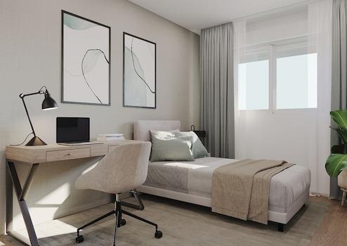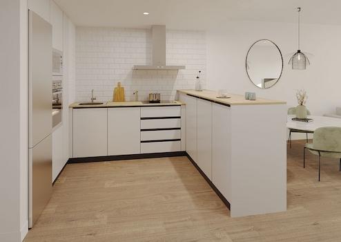 Alle Wohnungen bieten eine voll ausgestattete Küche mit Glaskeramikkochfeld, Dunstabzugshaube und Backofen, Klimaanlage mit Wärmepumpe, Warmwasser durch aerothermische Heizung, glatte weiße Farbe an Wänden und Decken, PVC-Türen und Fenster mit Doppelverglasung sowie Einbauschränke in allen Schlafzimmern.