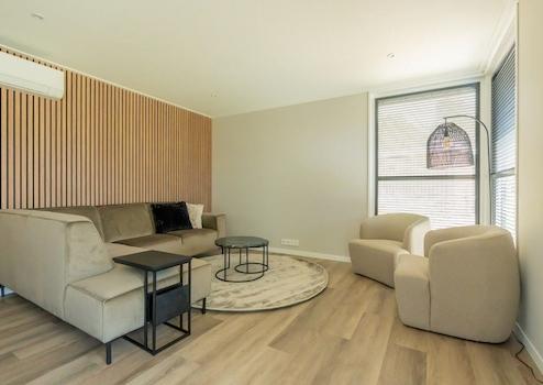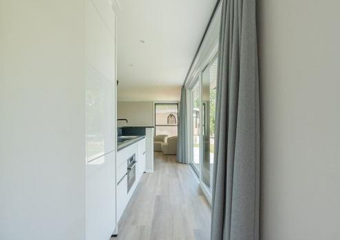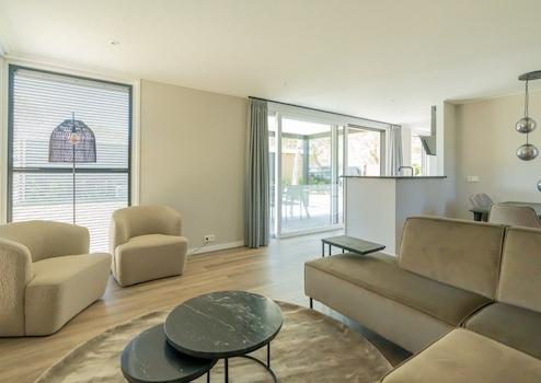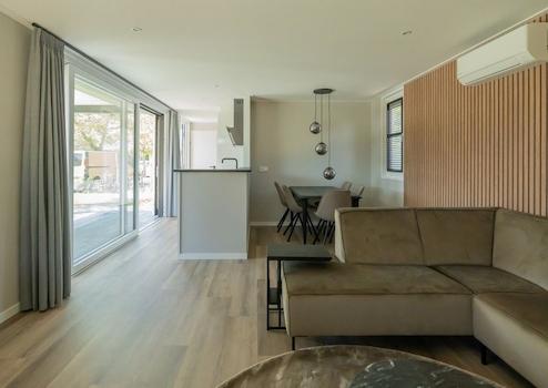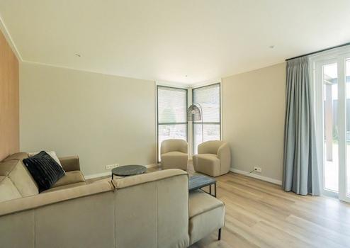 Das geräumige Wohnzimmer bildet das Herz dieses modernen Ferienhauses und strahlt Wärme und Stil aus. Die auffällige Holzwandverkleidung schafft eine luxuriöse Ausstrahlung und bildet einen schönen Kontrast zu den neutralen Tönen. Große Fenster sorgen für optimalen Lichteinfall und bieten Blick auf die grüne Umgebung. Die modernen Möbel mit Designelementen laden zur Entspannung ein. Die offene Verbindung zur Küche sorgt für ein räumliches Gefühl und macht es ideal für gemütliche Abende. Die Qualität der Ausstattung ist überall sichtbar, von den klaren Linien bis zur durchdachten Aufteilung. Dieses Wohnzimmer bietet Komfort und Eleganz für sowohl ruhige Momente als auch gesellige Zusammenkünfte.