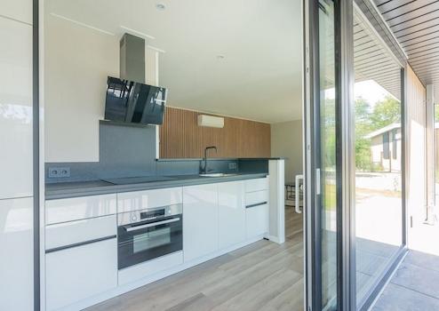 Die moderne offene Küche ist vollständig ausgestattet und strahlt Qualität aus. Hochglanz weiße Fronten kombiniert mit einer dunklen Arbeitsplatte schaffen eine zeitlose Ausstrahlung. Alle notwendigen Einbaugeräte sind für komfortables Kochen und Speisen vorhanden. Die praktische Aufteilung nutzt den verfügbaren Raum optimal. Durch die offene Verbindung zum Wohnzimmer entsteht eine soziale Kochinsel, wo Gäste mitgenießen können. Die klaren Linien und moderne Ausstattung passen perfekt zur Architektur des Hauses.