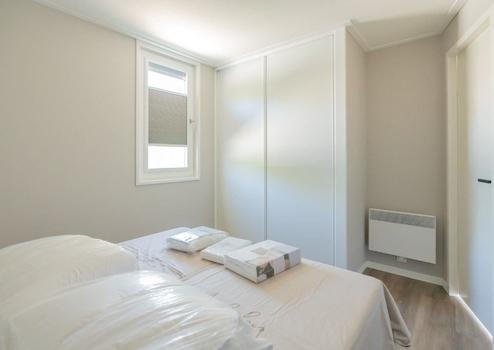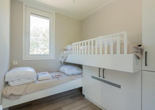 Das zweite Schlafzimmer ist clever eingerichtet mit einem praktischen Etagenbett, das perfekt für Kinder oder zusätzliche Gäste ist. Die weiße Ausführung sorgt für eine frische und helle Ausstrahlung. Ein großes Fenster bietet Blick auf die grüne Umgebung und sorgt für natürliche Belüftung. Der eingebaute Stauraum maximiert die Funktionalität dieses kompakten Raumes. Die durchdachte Aufteilung nutzt jeden Quadratmeter optimal. Dieses Zimmer zeigt, wie modernes Design und Funktionalität Hand in Hand gehen können.