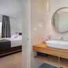 Eine Innentreppe führt ins Obergeschoss, wo sich ein Waschraum und drei Schlafzimmer befinden, jedes mit eigenem Bad. Das Hauptschlafzimmer, luxuriös und separat gelegen, öffnet sich zu einer großzügigen Terrasse mit Panoramablick auf das Meer.