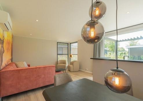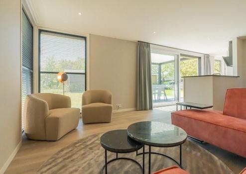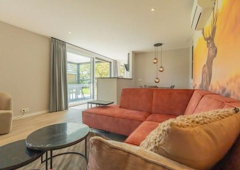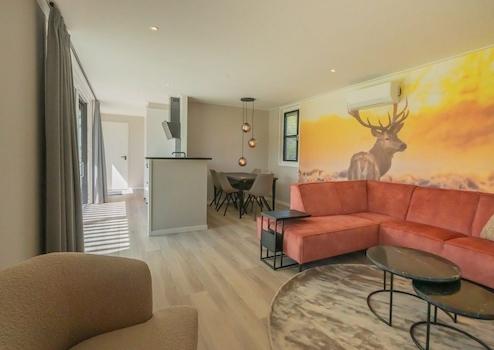Das geräumige Wohnzimmer bildet das Herz dieses Luxus-Chalets und strahlt Wärme und Stil durch das auffällige künstlerische Wandgemälde mit Hirschmotiv im Sonnenuntergang aus. Diese einzigartige Wanddekoration schafft eine stimmungsvolle und persönliche Ausstrahlung, die das Chalet von anderen Ferienhäusern unterscheidet. Das luxuriöse orange Ecksofa bildet einen wunderschönen Farbakzent und lädt zur Entspannung ein. Moderne Designbeleuchtung mit gläsernen Hängelampen sorgt für stimmungsvolle Beleuchtung während der Abendstunden. Die offene Verbindung zur Küche schafft ein räumliches Gefühl und macht es ideal für gesellige Abende. Große Fenster bieten Blick auf den grünen Ferienpark und sorgen für optimalen Lichteinfall. Die Qualität der Ausstattung ist überall in den klaren Linien und durchdachten Aufteilung sichtbar