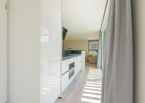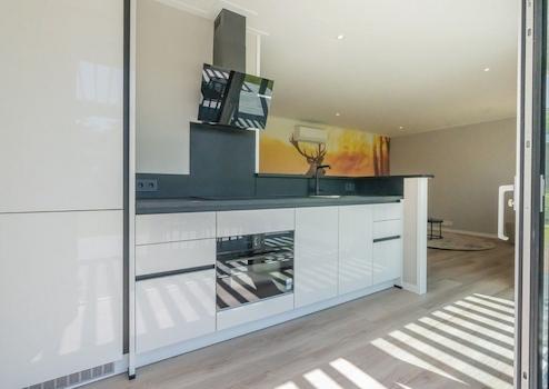Die moderne offene Küche ist vollständig ausgestattet und strahlt Qualität aus. Hochglanz weiße Fronten kombiniert mit einer dunklen Arbeitsplatte schaffen eine zeitlose und elegante Ausstrahlung. Alle notwendigen Einbaugeräte sind für komfortables Kochen und Speisen während Ihres Urlaubs vorhanden. Die klare Dunstabzugshaube und praktische Aufteilung nutzen den verfügbaren Raum optimal. Durch die offene Verbindung zum Wohnzimmer entsteht eine soziale Kochinsel, wo Gäste mitgenießen können. Die moderne Ausstattung und hochwertigen Materialien passen perfekt zur luxuriösen Ausstrahlung des Chalets.