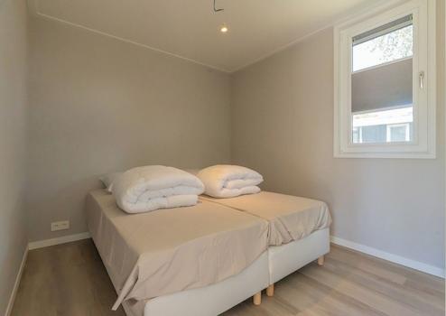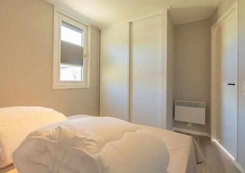 Das Hauptschlafzimmer bietet Ruhe und Komfort mit einer großzügigen Aufteilung und viel natürlichem Licht. Das komfortable Doppelbett steht zentral aufgestellt und lädt zur Entspannung nach einem Tag am Strand ein. Das große Fenster sorgt für angenehmen Lichteinfall und bietet Blick auf den grünen Ferienpark. Die neutralen Farben schaffen eine serene Atmosphäre, die perfekt für eine gute Nachtruhe ist. Das Zimmer ist praktisch eingerichtet mit ausreichend Bewegungsraum und Stauraum. Die Qualität der Ausstattung ist auch hier in den klaren Details und durchdachten Aufteilung sichtbar, die Komfort und Funktionalität kombiniert.