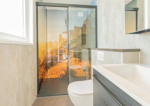 Das Luxusbadezimmer ist ein wahrer Höhepunkt dieses Chalets mit seiner künstlerischen Duschwand, die eine einzigartige Spa-Atmosphäre schafft. Das Landschaftsmotiv in warmen Tönen strahlt Ruhe aus und bildet einen wunderschönen Mittelpunkt des Raumes. Moderne Sanitäranlagen in hochwertiger Ausführung bieten allen Komfort für ein luxuriöses Badezimmererlebnis. Das schwebende Badmöbel mit Spiegelschrank kombiniert Funktionalität mit Stil. Die subtile Wandtextur verleiht dem Ganzen Eleganz. Große Fenster sorgen für natürliches Licht, während die Privatsphäre gewährleistet bleibt. Dieses Badezimmer strahlt Qualität aus und lädt zur Entspannung ein.