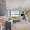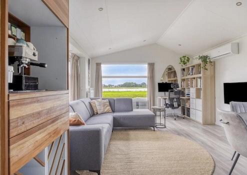 Durch die Schiebetür gelangen Sie vom Wohnzimmer direkt auf die Terrasse, von der aus Sie einen direkten Blick auf die Maas und die grasenden Shetlandponys in der Aue haben. Das Wohnzimmer ist hell und komfortabel, mit großen Fenstern, die ein echtes Innen-Außen-Erlebnis bieten.