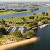 Mit Blick auf die Afgedamde Maas und mit Einrichtungen wie einer Rezeption, Sicherheitsdienst, Parkverwaltung, einem Bouleplatz, einem Spielplatz, einem Teich und dem Restaurant Den Duuk.
