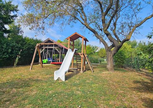 Könnyűszerkezetes lemezgarázzsal (20 nm), ásott kúttal-és kerti kiülővel is gazdagított.