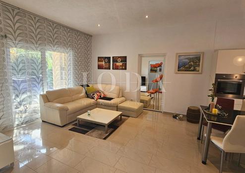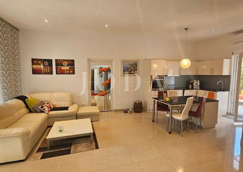 Die Wohnung besteht aus einem großen offenen Wohnzimmer mit Küche und Esszimmer, zwei Schlafzimmern, einem Badezimmer und einem Abstellraum. Der Wohnbereich geht nahtlos in den Garten mit einem möblierten Pavillon, einem Grill und einer Sommerküche über, ein idealer Ort, um an warmen Tagen im Schatten zu entspannen.