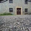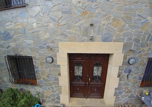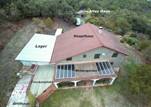 Das Haupthaus ist Außen komplett mit Bruchsteinen verkleidet. Auf der Rückseite ist ein Wintergarten angebaut, seitlich Garagen, Stellplätze und ein Lager.