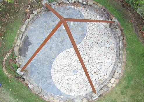 Der Außenbereich ist liebevoll angelegt unter anderem mit einem Ying-Yang Symbol unter einer stilisierten Holzpyramide. Im Garten befinden sich auch ein Grillraum mit Sitzmöglichkeiten sowie ein überdachter Trockenplatz für Ihre Wäsche.