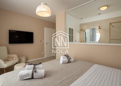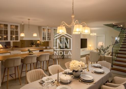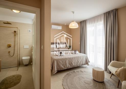 Beim Betreten der Villa werden Sie von luftigen und hellen Räumen begrüßt, die Eleganz und Luxus ausstrahlen. Das Erdgeschoss ist im offenen Raumkonzept gestaltet und verfügt über eine modern ausgestattete Küche, ein Esszimmer und ein geräumiges Wohnzimmer, die zusammen das Zentrum des Hauses bilden. Das im Erdgeschoss gelegene Hauptschlafzimmer ist mit einem eigenen Bad ausgestattet, was zusätzlichen Komfort und Privatsphäre bietet.