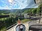 Vom Obergeschoss hat man Blick auf Grünflächen und Berge, das Meer ist in der Ferne sichtbar.