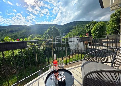 Vom Obergeschoss hat man Blick auf Grünflächen und Berge, das Meer ist in der Ferne sichtbar.
