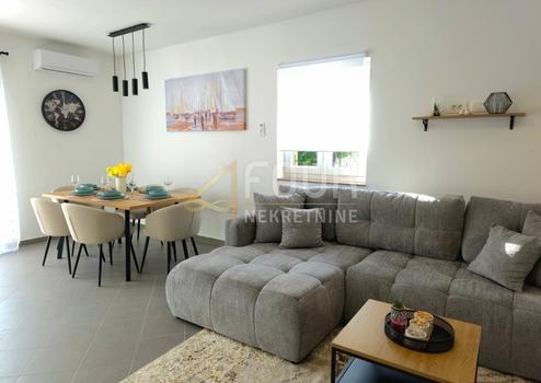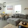 Das Erdgeschoss ist als 82,46 m² große Wohnung konzipiert und besteht aus einem offenen Wohnbereich mit Küche und Essbereich mit Zugang zum Balkon, Badezimmer und zwei Schlafzimmern.