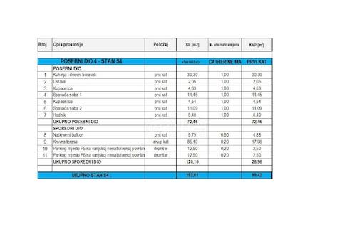 Vodice, Neubau, attraktive Lage, komfortable Zwei-Zimmer-Wohnung im 1. Stock. Die Wohnung S4 befindet sich in einem kleinen Wohngebäude mit insgesamt 4 Wohnungen, verfügt über ein modernes Design und einen funktionalen Grundriss mit insgesamt 99,42 m² Nutzfläche und Meerblick. Die Wohnung besteht aus einer geräumigen Küche mit Ess- und Wohnbereich, Flur, zwei Schlafzimmern, von denen eines ein eigenes Bad hat, sowie einem zusätzlichen separaten Bad, Abstellraum, überdachter Terrasse von 9,75 m² und einer Dachterrasse von 85,40 m² mit Stromanschluss und Wasseranschlüssen für eine Sommerküche und Jacuzzi. Sie ist mit hochwertigen Materialien ausgestattet: moderne Keramik und Sanitäreinrichtungen, Fußbodenheizung in der gesamten Wohnung, dreifach verglaste Fenster sowie elektrische Rollläden, Klimaanlagen im Wohnzimmer und in allen Schlafzimmern. Zur Wohnung gehören zwei Parkplätze. Die Wohnung liegt m vom Plava-Strand und 700 m vom Zentrum von Vodice entfernt.