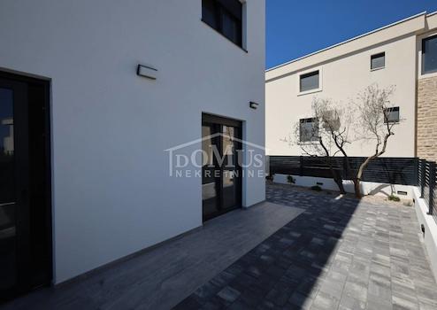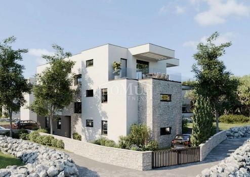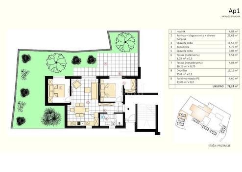 Murter, attraktive Lage, 580 m vom Strand entfernt, Neubau, Zweizimmerwohnung mit einer Gesamtnutzfläche von 78,24 m². Die Wohnung mit der Kennzeichnung AP1 befindet sich im Erdgeschoss eines Wohngebäudes mit insgesamt fünf Wohnungen. Sie hat eine Wohnfläche von 52,94 m², besteht aus Flur, Bad, zwei Schlafzimmern, einer geräumigen Küche mit Essbereich und Wohnzimmer als Ganzes mit Zugang zu einer überdachten und einer nicht überdachten Terrasse. Die Wohnung ist von einem privaten Garten von 75,8 m² umgeben. Zur Wohnung gehört auch ein Parkplatz mit insgesamt 23,06 m². Sie ist ausgestattet mit Klimaanlage, Fußbodenheizung im Bad und Wohnzimmer, Video-Gegensprechanlage, hochwertiger Keramik und Sanitärmaterialien, elektrischen Rollläden an großen Terrassentüren und Moskitonetzen an den Fenstern. Sie ist 580 m vom Meer/Strand und auch 580 m vom Stadtzentrum entfernt.