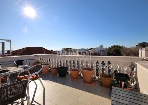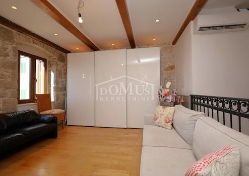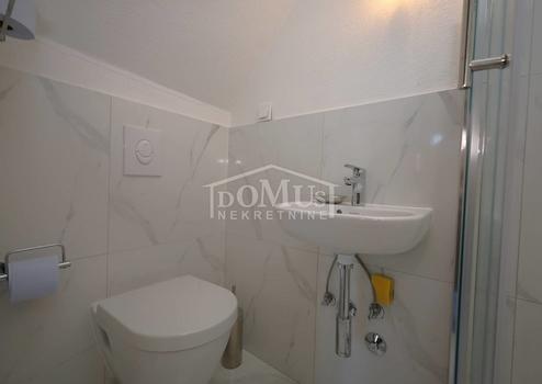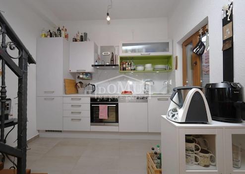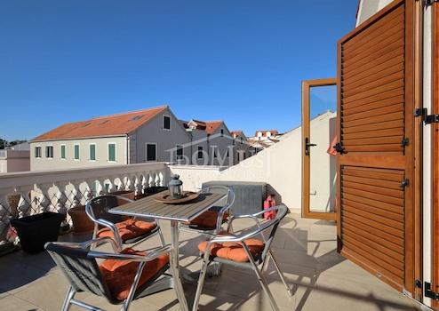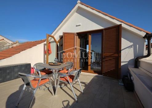 Vodice, Stadtzentrum, komplett renoviertes Steinhaus im rustikalen Stil. Das Haus liegt in unmittelbarer Nähe zur Uferpromenade und zum Strand und verfügt über 4 Etagen (Erdgeschoss + 1. Obergeschoss + 2. Obergeschoss + hohes Dachgeschoss) mit einer Gesamtnutzfläche von 170,1 m². Im Erdgeschoss befindet sich eine Geschäftsfläche von 46,6 m², während sich die dreistöckige Wohnung von 123,5 m² über das 1. Obergeschoss, das 2. Obergeschoss und das Dachgeschoss erstreckt. Das Haus verfügt über zwei Terrassen: im ersten Stock gibt es eine Terrasse von 3,00 m² und im Dachgeschoss eine geräumige Terrasse von 23,57 m² mit Blick auf die Innenstadt, den Park und das Meer. Im 1. OG befinden sich ein Flur und zwei Schlafzimmer mit jeweils eigenem Badezimmer. Im 2. OG befindet sich eine Küche mit Esszimmer und Wohnzimmer als Einheit, sowie ein zusätzliches WC. Im Dachgeschoss befindet sich ein Schlafzimmer mit Bad und Zugang zu einer großzügigen Terrasse mit schöner Aussicht. Bei der Renovierung des Hauses wurden hochwertige Materialien verwendet. Das Haus ist für Tourismus und Vermietung geeignet, ist voll möbliert und sofort bezugsfertig. Im Preis der Immobilie ist die komplette Möblierung enthalten. Zusätzlich besteht die Möglichkeit der Nutzung zweier PKW-Stellplätzen auf einem Grundstück welches 750m vom Haus entfernt ist. Die Entfernung zum Meer beträgt 50 m und zum angelegten Strand 250 m.