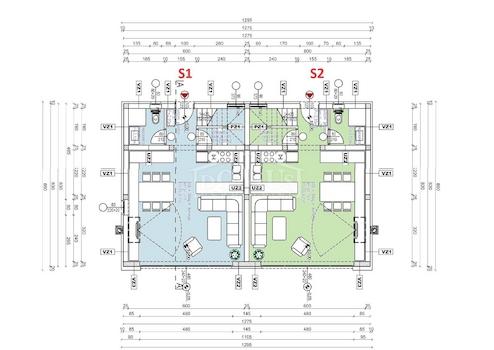 Einfamilienhaus in Tisno, 480 m vom Kiesstrand entfernt. Das Haus ist eine Doppelhaushälfte auf drei Etagen: Erdgeschoss, 1. OG und 2. OG / Dachterrasse mit insgesamt 96,14 m² Nutzfläche und 60 m² Garten mit einer großen Terrasse von 15 m². Das Erdgeschoss des Hauses besteht aus einem Flur, einem Badezimmer, einem Abstellraum, einem großen Wohnzimmer mit Küche und Esszimmer mit Zugang zu einer Terrasse mit angrenzendem Garten. Im 1. Stock des Hauses befinden sich drei Schlafzimmer, ein Badezimmer und ein Flur. Im 2. Stock des Hauses befindet sich eine große Dachterrasse von 24,50 m² mit Blick auf das Meer. Das Haus ist komplett fertiggestellt und sofort bezugsfertig. Es ist mit einbruchhemmenden Türen, ALU-Zimmerei mit elektrisch gesteuerten Jalousien, Fußbodenheizung in den Badezimmern und Klimaanlage in jedem Zimmer ausgestattet. Die Umgebung ist mit mediterranen Pflanzen geschmückt und der Parkplatz ist gepflastert. Das Haus liegt 300 m vom Meer und 1000 m vom Stadtzentrum entfernt.
