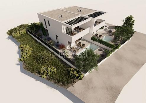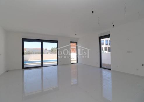Familienhaus in Srima, 550 m vom Kiesstrand und dem Stadtzentrum entfernt. Das Haus ist ein zweistöckiges Gebäude, auf zwei Etagen EG + 1. Stock mit 117,57 m2 Gesamtnutzfläche und 150 m2 Garten mit großer Terrasse und einem 12 m2 großen Pool. Das Erdgeschoss des Hauses besteht aus einem überdachten Eingang, einem Gäste-WC, einem Flur, einem großen Wohnzimmer mit Küche und einem Esszimmer mit Zugang zu einer überdachten Terrasse mit Swimmingpool und angrenzenden Garten. Im 1.Stock des Hauses befinden sich drei Schlafzimmer, zwei Badezimmer, ein Flur, ein Kleiderschrank und eine große Terrasse von 14,89 m2. Die Terrasse ist mit einer Pergola überdacht. Das Haus wird mit einbruchhemmenden Türen, ALU-Zimmerei mit elektrisch betriebenen Jalousien, Fußbodenheizung im Wohnzimmer und Badezimmer, jedem Zimmer mit Klimaanlage, einem 200-l-Warmwasserboiler und Videoüberwachungsanlagen ausgestattet. Die Umgebung wird mit mediterranen Pflanzen geschmückt. Gepflasterter Parkplatz.