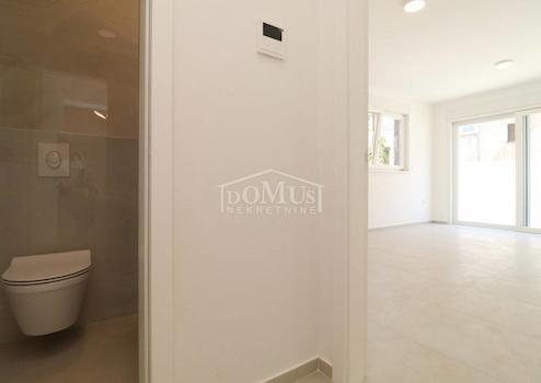 Neubau, 1. Reihe zum Meer, Zweizimmerwohnung mit insgesamt 93,56 m2 Nutzfläche, welche sin im Erdgeschoss eines Wohnhauses befindet, das über insgesamt drei Etagen mit insgesamt 5 Wohneinheiten verfügt, und zum Nordwesten ausgerichtet ist. Die Wohnung besteht aus einer Küche, einem Esszimmer und einem Wohnzimmer als Ganzes, einem Abstellraum, einer Toilette, 3 Fluren, zwei Schlafzimmern und einem Badezimmer. Die Wohnung hat einen Garten von 149,37m2 und einen Parkplatz. Die Wohnung ist unmöbliert, sie wurde aus hochwertigen Materialien gebaut, ausgestattet mit Klimaanlage in allen Räumen, Fußbodenheizung im Bad, elektrische Rollläden, Moskitonetze, Video-Gegensprechanlage. Bezug geplant für Sommer Käufer sind von der Zahlung der Grundumsatzsteuer befreit.