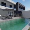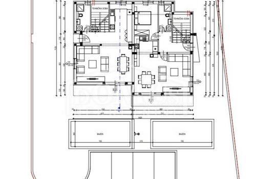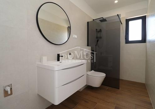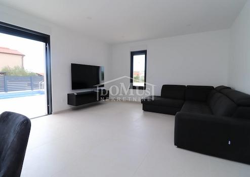 Ein schönes Einfamilienhaus mit moderner Architektur und sehr funktionalem Grundriss in Vodice in ruhiger Lage, 950 m vom Kiesstrand und 750 m vom Stadtzentrum entfernt. Das Haus ist ein Doppelhaus (Westseite) auf zwei Etagen: Erdgeschoss + 1. Stock mit 125,62 m2 Gesamtnutzfläche und 230 m2 Garten mit einem Außenpool von 21 m2 und einem geräumigen Parkplatz. Das Erdgeschoss verfügt über ein geräumiges Wohnzimmer, Küche und Esszimmer, Abstellraum, Badezimmer, Flur und eine große Terrasse am Pool. Im 1. Stock befinden sich drei Schlafzimmer, ein Badezimmer, ein WC und eine Loggia. Das Haus ist mit modernen und hochwertigen Materialien gebaut wie: Thermofassade 10 cm, anthrazitfarbene Zimmerei mit elektrischen Rollläden und Moskitonetzen, moderne Sanitärkeramik in den Bädern, elektrische Fußbodenheizung in allen Bädern im Erdgeschoss und aufwärts Die erste Etage, alle Schlafzimmer und das Wohnzimmer sind mit Wärmepumpen ausgestattet. Das Haus verfügt über zwei gepflasterte Parkplätze.