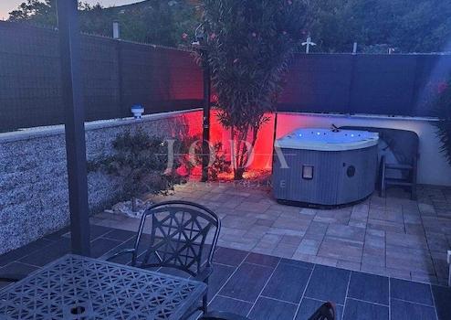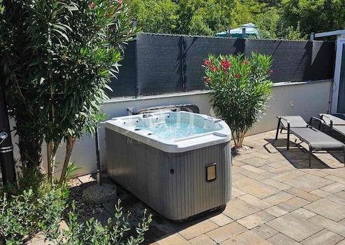 Teil des angelegten und umzäunten Hofes ist ein vorgefertigtes Wohngebäude im Freien mit einem komfortablen Schlafzimmer, sodass es sich im Wesentlichen um eine Zweizimmerwohnung mit Wohnzimmer und Terrasse handelt. Im Garten befindet sich außerdem ein Whirlpool.