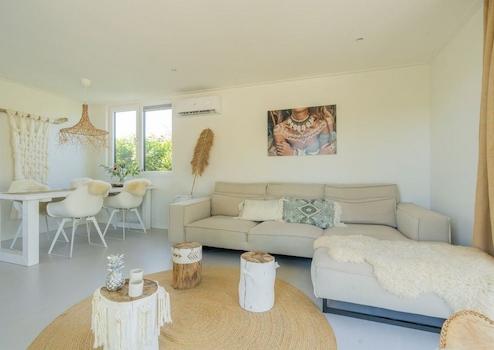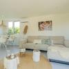 Das helle Wohnzimmer bildet das Herz dieses Ibiza-Stil Chalets und strahlt Ruhe durch die durchdachte Einrichtung mit natürlichen Materialien und warmen Farbtönen aus. Der luxuriöse Estrichboden verleiht dem Chalet eine moderne und pflegeleichte Ausstrahlung. Viel natürlicher Lichteinfall durch große Fenster schafft eine offene und einladende Atmosphäre. Die Klimaanlage sorgt für optimalen Komfort an warmen Sommertagen, während die Fußbodenheizung in kühleren Perioden Wärme bietet. Die bodentiefe Schiebetür schafft eine nahtlose Verbindung zur Südterrasse. Alle Beleuchtung ist dimmbar für perfekte Stimmungsbeleuchtung während geselliger Abende. Die Ibiza-Stil Dekoration mit natürlichen Akzenten und Pflanzen verstärkt das Urlaubsgefühl. Die offene Verbindung zur Küche macht es ideal für geselliges Beisammensein und Entspannung.
