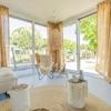 Das Hauptschlafzimmer strahlt Ibiza-Atmosphäre mit natürlichen Materialien, Schiebetür und warmen Akzenten aus. Die Verdunkelungsfenster sorgen für optimale Nachtruhe nach einem Tag am Strand oder in der Natur. Der Durchgang zum begehbaren Kleiderschrank bietet viel Stauraum für alle Urlaubsbedürfnisse. Das große Fenster bietet Blick auf das grüne Grundstück und sorgt für angenehmen Lichteinfall tagsüber. Die neutralen Farben kombiniert mit natürlichen Holzelementen schaffen eine serene Atmosphäre, die perfekt für Entspannung ist. Die Qualität der Ausstattung zeigt sich in den klaren Details und durchdachten Aufteilung, die Komfort und Stil kombiniert.