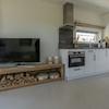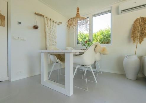Die vollständig ausgestattete offene Küche verfügt über alle modernen Geräte für optimalen Kochkomfort während Ihres Urlaubs. Kühlschrank, Gefrierschrank, Kombi-Ofen, Geschirrspüler und Induktionskochfeld machen Selbstversorgung zu einem wahren Vergnügen. Die klaren weißen Fronten kombiniert mit natürlichen Materialien passen perfekt zum Ibiza-Stil des Chalets. Die Fußbodenheizung sorgt für zusätzlichen Komfort in diesem gaslosen Chalet. Die dimmbare Beleuchtung schafft stimmungsvolle Momente beim Kochen und Speisen. Die praktische Aufteilung nutzt den verfügbaren Raum optimal.