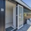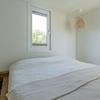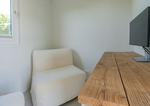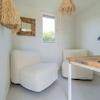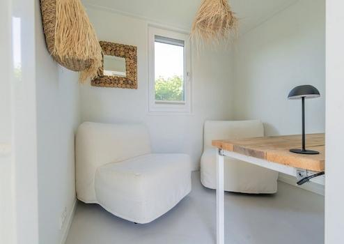 Der zweite Raum ist multifunktional eingerichtet und kann sowohl als Schlafzimmer als auch als Büro genutzt werden, was zusätzliche Flexibilität bietet. Derzeit als Büro mit modernen Möbeln und viel natürlichem Licht für produktives Arbeiten eingerichtet. Die Verdunkelungsfenster machen es auch perfekt geeignet als zweites Schlafzimmer für Gäste oder Kinder. Das große Fenster sorgt für natürliche Belüftung und Lichteinfall. Dieser flexible Raum zeigt die Vielseitigkeit des Chalets und macht es geeignet für verschiedene Nutzungszwecke. Die moderne Einrichtung passt perfekt zum Ibiza-Stil des gesamten Chalets und bietet Komfort für sowohl Arbeit als auch Entspannung.