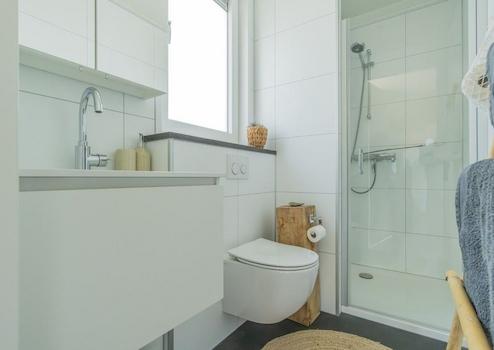 Das stilvolle Badezimmer kombiniert moderne Funktionalität mit Ibiza-Stil Eleganz. Die geräumige begehbare Dusche bietet luxuriöses Duscherlebnis, während das schwebende WC und Waschtischmöbel eine räumliche Ausstrahlung schaffen. Natürliche Materialien und warme Akzente passen perfekt zur Ibiza-Atmosphäre des Chalets. Ein großes Fenster sorgt für natürliches Licht, während die Privatsphäre gewährleistet bleibt. Die klaren weißen Fliesen kombiniert mit Holzelementen strahlen Qualität aus. Dieses Badezimmer zeigt, wie moderne Sanitäranlagen und natürliche Stilelemente perfekt zusammengehen können für ein luxuriöses und entspannendes Badezimmererlebnis, das zum Urlaubsgefühl passt.