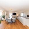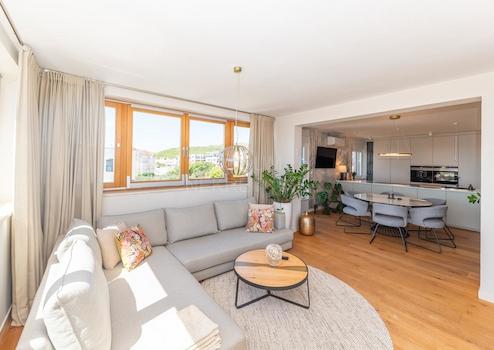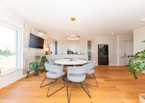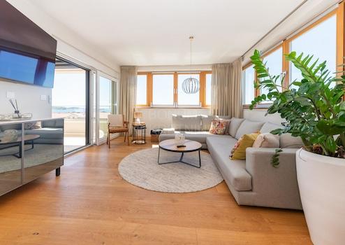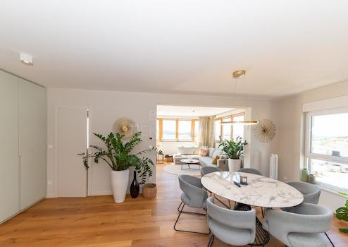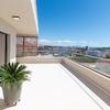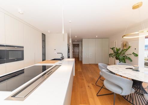 Die Wohnung verfügt über zwei Terrassen, die sie besonders attraktiv machen: Die überdachte Terrasse an der Südwestseite mit 48,25 m² lädt zum Verweilen und Genießen des Meerblicks ein, während die nicht überdachte Terrasse an der Südostseite mit 17,81 m² zum Sonnenbaden und Entspannen einlädt. Außerdem gibt es einen 14 m² großen Parkplatz im Hof und einen geräumigen Garagenplatz im Untergeschoss mit 33,4 m².