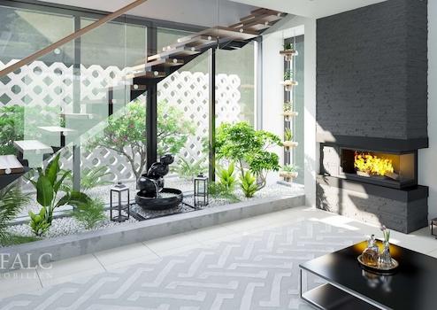 Ein besonderes Highlight ist die Stahltreppe und der Innengarten, der das Haus mit der Natur verbindet. Die Villa ist mit solarenergieverstärktem Warmwasserspeicher und VRF-Klimasystemen ausgestattet. Die Sanitärartikel von Hansgrohe reduzieren den Wasserverbrauch und es gibt einen 5-Tonnen-Wassertank mit Drucktanksystem.