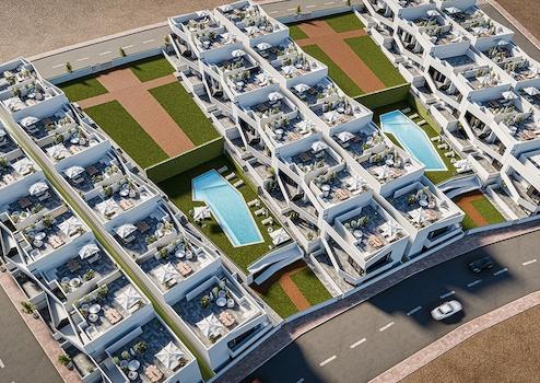 In dieser Wohnanlage am Ortsrand von San Miguel de Salinas entstehen wunderschöne Wohnungen mit 2 oder 3 Schlafzimmern und 2 Badezimmern und mit großzügigen Terrassen in schöner grüner Umgebung. Die Wohnungen verteilen sich über nur 2 Etagen, im Erdgeschoss mit privatem Garten und im Obergeschoss mit privater Dachterrasse. Die abgeschlossene und sehr schön gestaltete Wohnanlage bietet zwei Gemeinschaftspools.