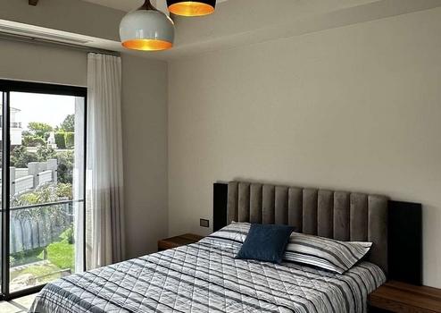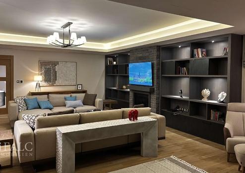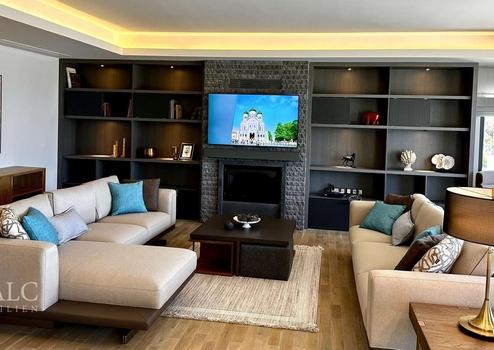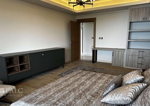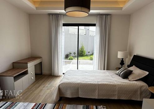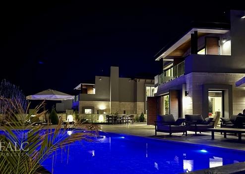 Im Obergeschoss befinden sich drei weitere Schlafzimmer, jedes mit eigenem Badezimmer. Das Hauptschlafzimmer verfügt über einen begehbaren Kleiderschrank und einem privaten Balkon mit Panoramablick. Weitere Highlights der Villa sind der hochwertige Parkett- und Marmorboden, die Alarmanlage, die Klimaanlage und der Privatparkplatz.