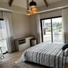 Im Erdgeschoss befinden sich ein großzügiger Wohnbereich mit Kamin und Zugang zur Terrasse, eine moderne Einbauküche mit hochwertigen Geräten und ein Schlafzimmer mit en-suite Badezimmer. Die Fensterfronten sorgen für viel Tageslicht und bieten einen atemberaubenden Blick auf das Meer.