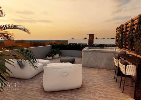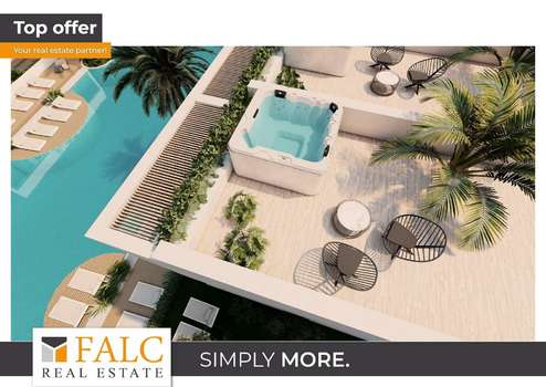 Dieses exklusive Penthouse erstreckt sich über zwei Etagen und bietet auf 84 m² modernen Wohnkomfort. Die lichtdurchfluteten Räume umfassen zwei geräumige Schlafzimmer, zwei elegante Badezimmer sowie ein offenes Wohnkonzept mit einer stilvollen Einbauküche. Hochwertige Bodenbeläge aus Fliesen und Laminat verleihen dem Interieur eine warme und einladende Atmosphäre. Besondere Highlights der Immobilie sind der Außenstellplatz, der großzügige Pool und die Sauna, die zu einem entspannenden Lebensstil beitragen. Klimaanlagen sorgen für angenehme Temperaturen in allen Jahreszeiten.