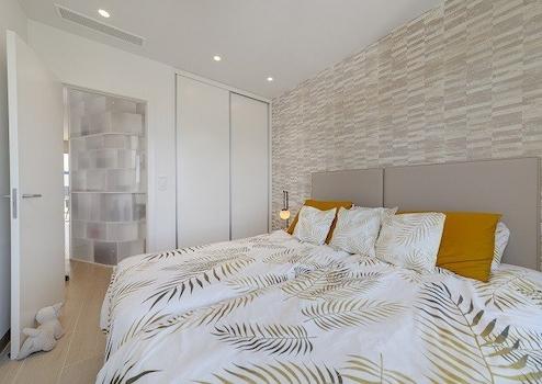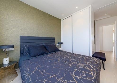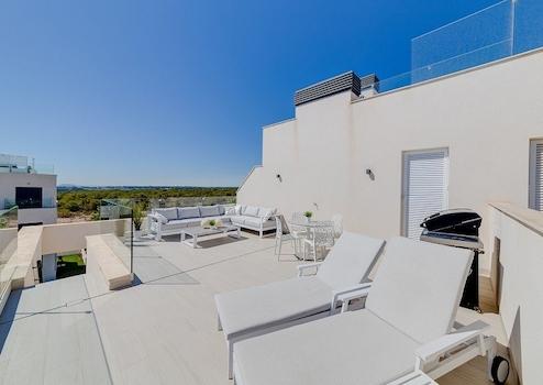 Das helle und geräumige, für modernes Wohnen konzipierte Open-Plan-Layout verfügt über raumhohe Schiebetüren, die den Innenbereich nahtlos mit der beeindruckenden 20 m² großen Terrasse verbinden, die mit einer Sonnenmarkise für zusätzlichen Komfort ausgestattet ist. Die ultramoderne weiße Küche fügt sich mühelos in den Wohnbereich ein und sorgt für eine elegante und minimalistische Ästhetik. Beide Doppelschlafzimmer verfügen über Einbauschränke, während die Master-Suite mit einem stilvollen eigenen Duschbad ausgestattet ist. Ein separates, modernes Familien-Duschbad vervollständigt die Innenausstattung. Von der Terrasse aus gelangt man auf eine private 40 m² große Dachterrasse, die einen atemberaubenden Panoramablick und viel Platz zum Entspannen im Freien bietet.