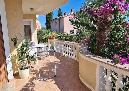 Es liegt in einem gepflegten Garten mit mediterranen Pflanzen und es gibt auch einen Parkplatz für 4 Autos.