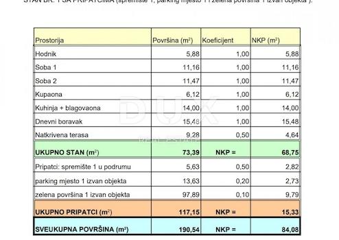 Nicht weit vom Zentrum von Matulji, in Jušići, verkaufen wir eine Erdgeschosswohnung bestehend aus: - Flur, - zwei (2) Schlafzimmern, - Küche + Esszimmer, - Wohnzimmer, - Badezimmer, - überdachter Terrasse, alles im Erdgeschoss, und Folgendem: - einem Abstellraum (gekennzeichnet mit Nr. 1) im Keller, - einem Parkplatz (gekennzeichnet mit Nr. 1), - Grünfläche (gekennzeichnet mit Nr. 1) außerhalb des Gebäudes, alles grün markiert. Die Gesamtfläche des Wohnteils beträgt 73,39 m², die Nebenflächen 117,15 m². Die Gesamtfläche des Sonderteils beträgt 190,54 m². Das Anwesen ist mit hochwertiger PVC-Tischlerei und elektrischer Fußbodenheizung ausgestattet. Die Mehrwertsteuer ist im Preis enthalten, sodass der zukünftige Käufer beim Erwerb der Immobilie keine Steuern zahlt.