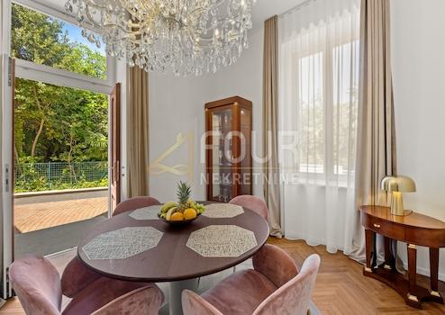 Eine freistehende Villa steht zur Miete, gelegen in einer attraktiven Lage in Opatija, nur wenige Gehminuten vom Meer entfernt. Die Gesamtfläche der Villa beträgt 245 m², verteilt auf Erdgeschoss, ersten Stock und Dachgeschoss, auf einem Grundstück von 759 m² mit einem gepflegten Garten von 618 m².