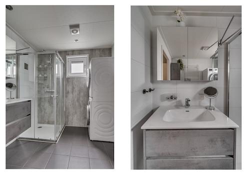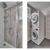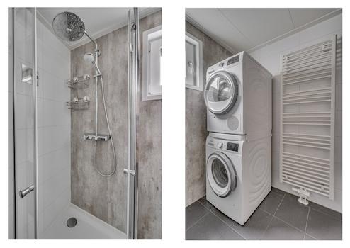 Regendouche, waschmaschinenanachluss und Waschbeckenunterschrank.