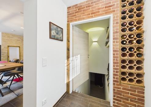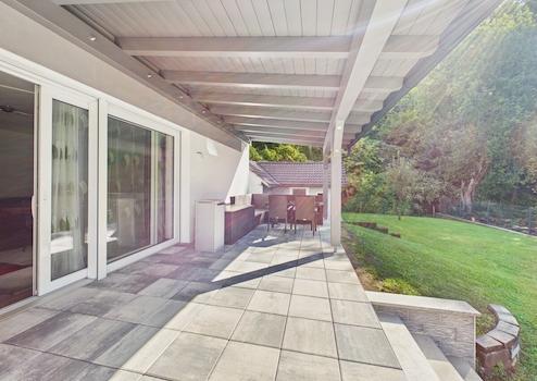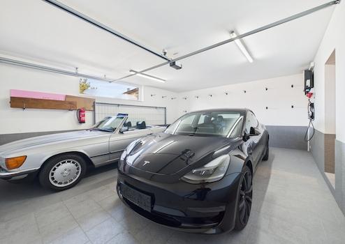 Besonders komfortabel ist die Doppelgarage mit Ladeanschluss für Elektrofahrzeuge, über der sich eine weitere sonnige Südwest-Terrasse mit ca. 35 m² erstreckt. Ein Nebengebäude ergänzt das Angebot und eignet sich perfekt als Werkstatt, Lager oder Geräteraum.