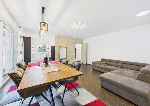 Dieses moderne Einfamilienhaus, erbaut im Jahr 2016, vereint zeitgemäßen Wohnkomfort mit durchdachter Architektur. Herzstück ist das großzügige, helle Wohnzimmer mit offen gestalteter Küche, das nahtlos in eine weitläufige, überdachte Südterrasse übergeht – ideal für gesellige Stunden im Freien.