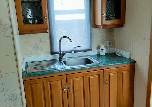 Voll ausgestattete Küche. Großer Backofen, Kombi-Mikrowelle und Kühlschrank mit Gefrierfach.