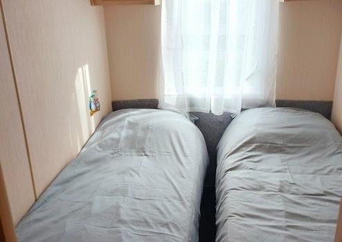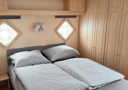 chlafzimmer mit Doppelbett und viel Stauraum. Heizdecken sind vorhanden. Brandneue Bettwäsche.