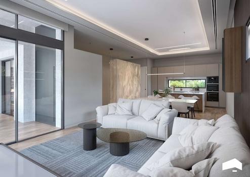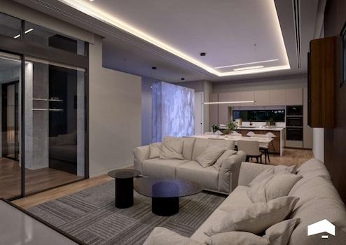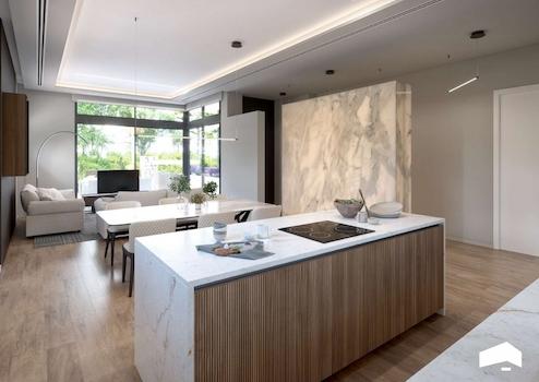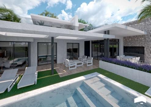 Erdgeschoss: Auf 157 m² befinden sich drei große Schlafzimmer, zwei luxuriöse Badezimmer und ein zusätzliches WC für die Terrasse und den Poolbereich. Das offene Wohnzimmer und die Küche verfügen über eine extra hohe Decke, die ein beeindruckendes Raum- und Helligkeitsgefühl vermittelt.