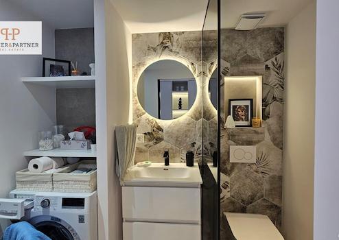 - Großformatige Fliesen und hochwertige Stein-Sockelleisten